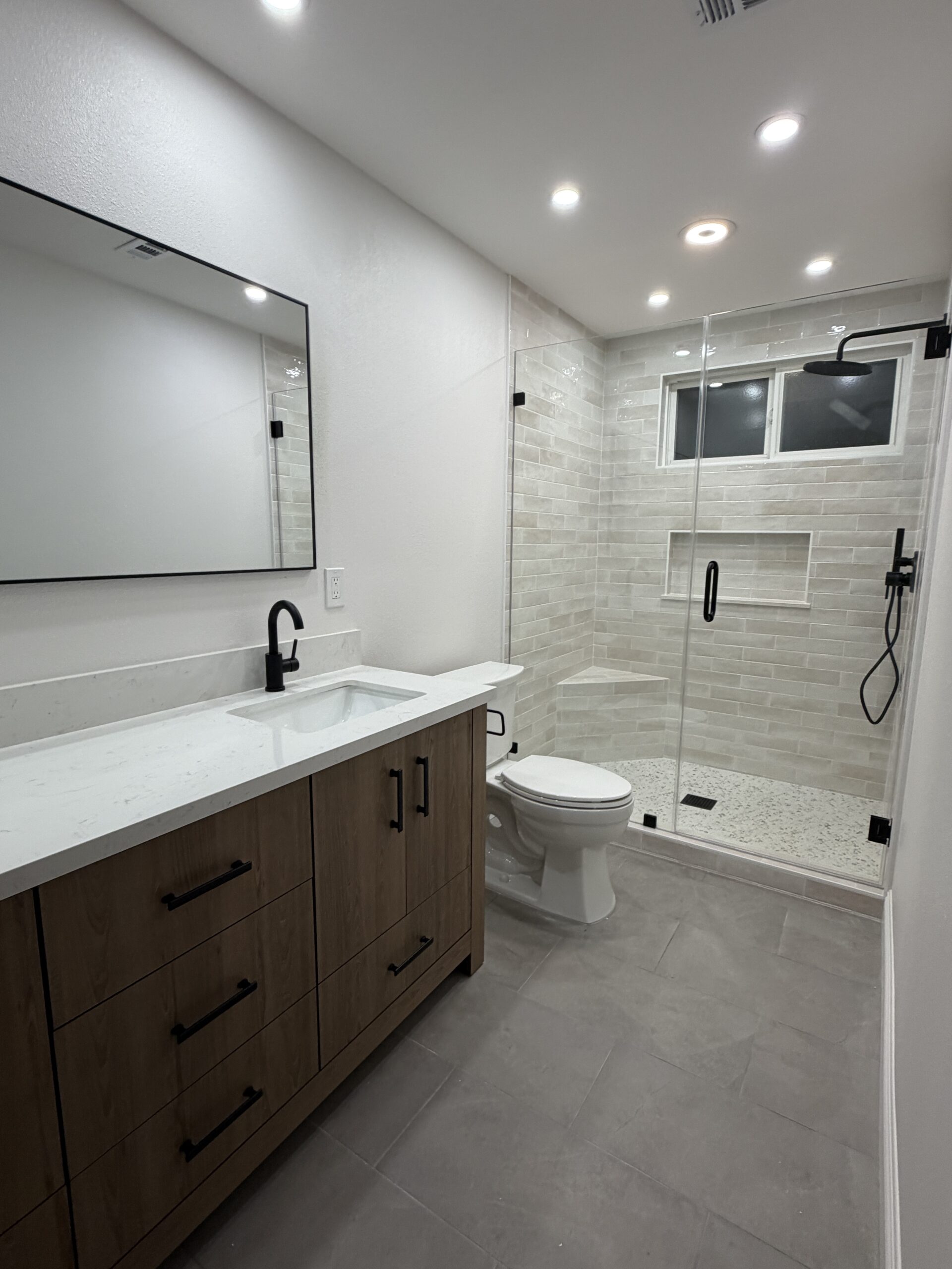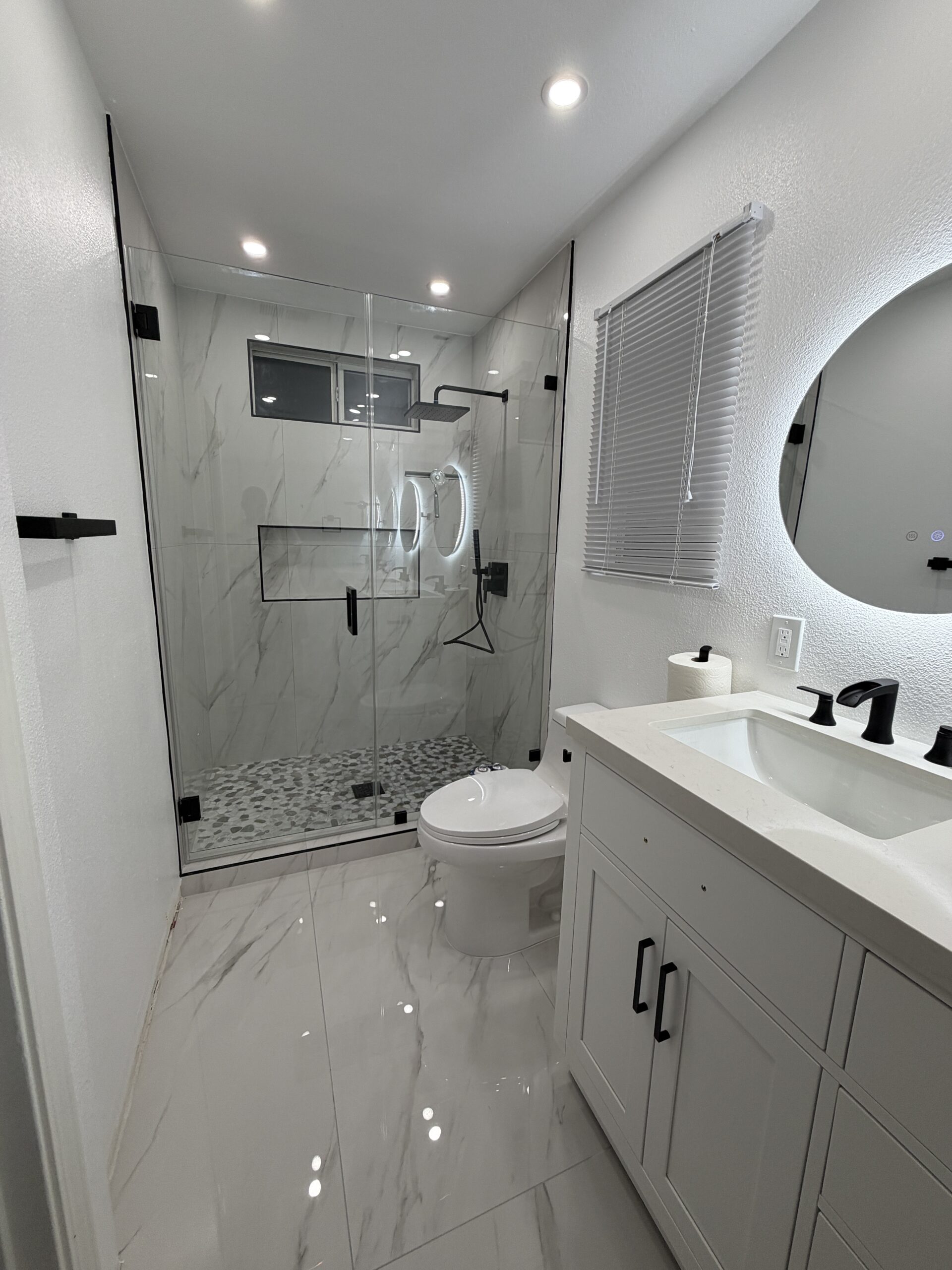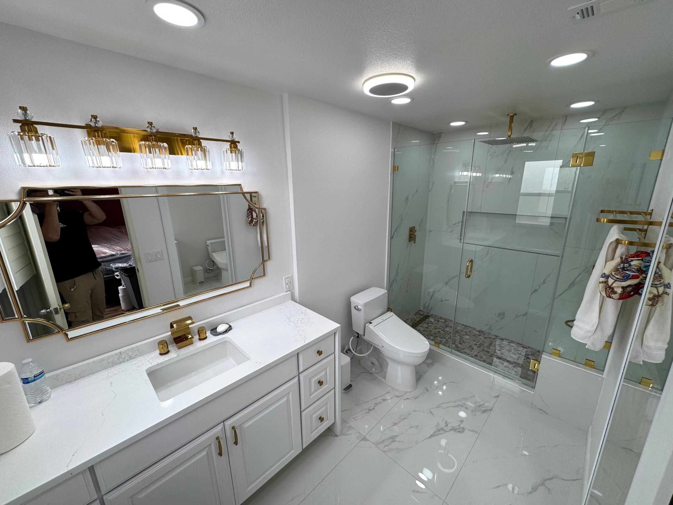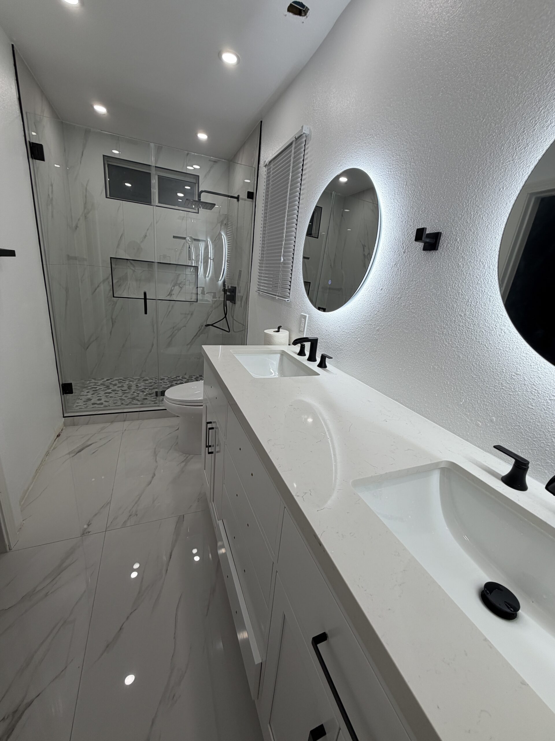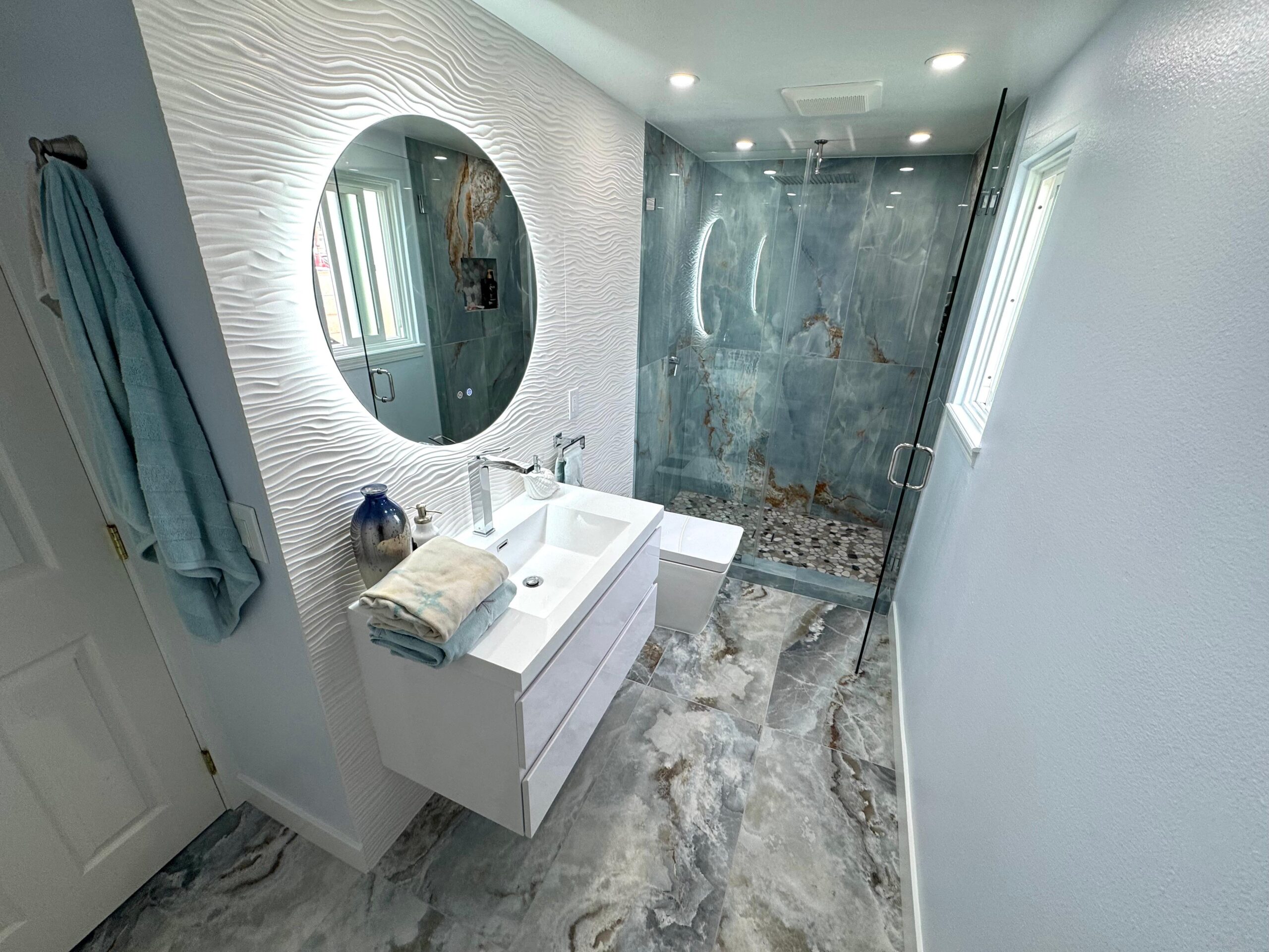 We offer complete bathroom remodeling services, including demolition of the old bathroom, electrical work, plumbing, tub or shower installation, tile, painting, vanity installation, recessed lighting, mirrors, and fixtures. We provide a full turnkey solution from start to finish.